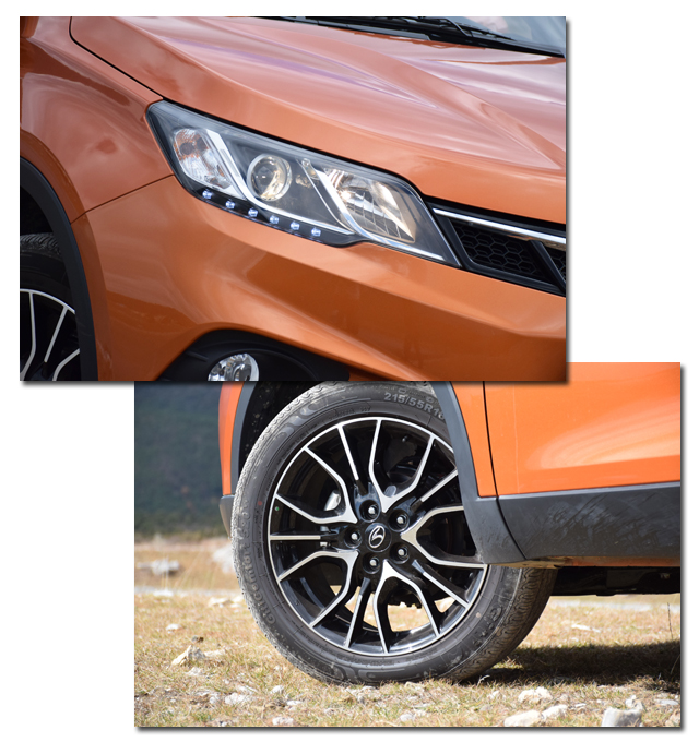虽说全系标配的都是卤素大灯(可选装氙气大灯),但是大灯的造型是相当犀利,下方的六颗LED日间行车灯还有蓝色的点缀,设计特别用心特别有个性。中低配的车型都用上了17寸的轮毂,和同级别的瑞风S3和长安CS35采用的15、16寸轮毂相比,无疑东南DX3更大气一些,更何况顶配车型还是采用了18寸的双色全铝合金轮毂,凸显的运动气息特别适合东南DX3这样年轻有个性的车型。