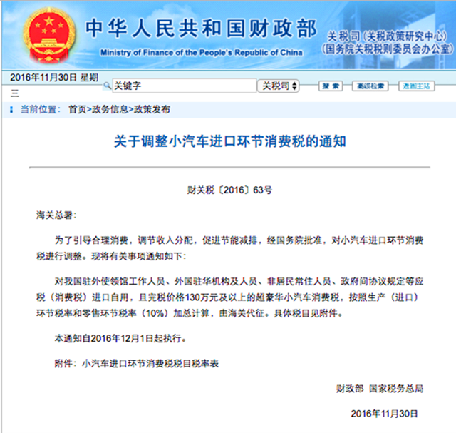 还是一项与税有关的政策。上一条是国家鼓励和促进小排量汽车消费,这一条则是对超豪华车的“限制”。此项政策一出,售价超130万的高端豪车将会比先前多花一笔不小的费用。