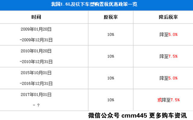 2015年9月29日,国务院召开会议,为促进小排量汽车发展,决定对购买1.6L及以下排量的乘用车实行车辆购置税减半的优惠政策,即10%税率降为按5%税率征收。简单的理解就是相当于在之前的购置税基础之上打五折。实行日期为2015年10月1日-2016年12月31日。