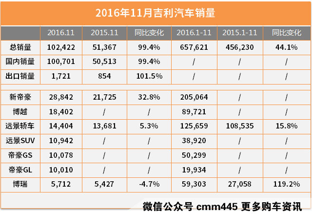吉利11月份的总销量为102422辆,去年同期为51367,同比增长99.4%,销量几乎翻倍。旗下主力车型个个生龙活虎的,销量增长很快。