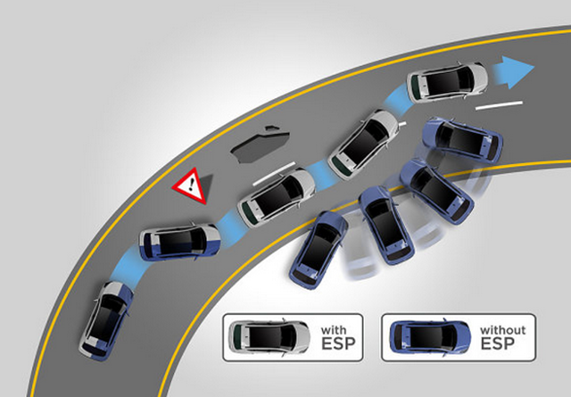 当电子稳定程序检测到车辆将要失控,向特定的车轮施加制动力帮助车辆按照驾驶者期望方向前进,在冰雪、湿滑环境ESP尤为重要。