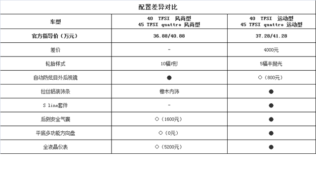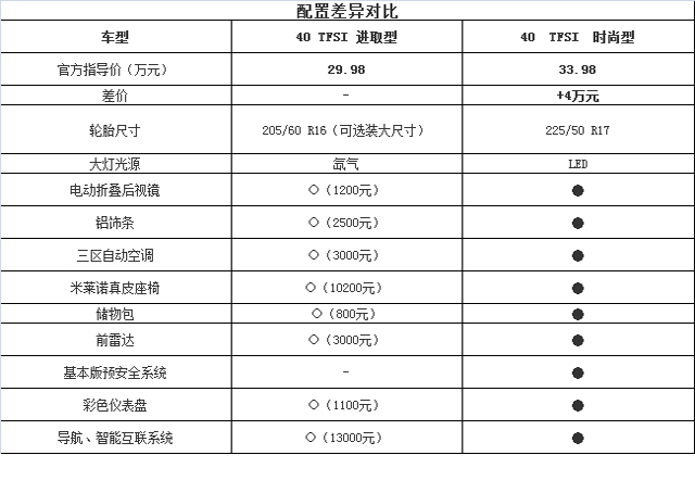 时尚型相比入门版本的进取型要贵4万块钱,但却能换来LED大灯光源、更大的轮毂和铝饰条装饰,外观更拉风高档之余,内部配置亦多了真皮座椅、前雷达和彩色仪表盘等实用配置。教授认为40 TFSI 时尚型的效费比更为理想。