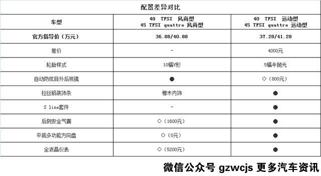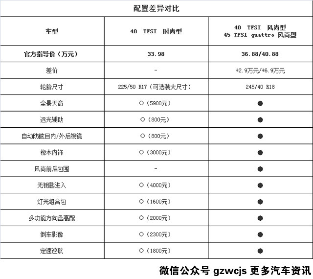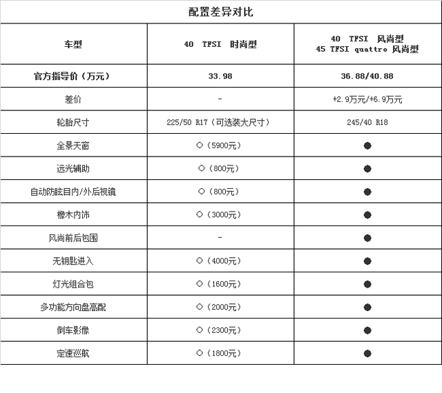 接下来看看40 TFSI 时尚型与风尚型配置的差距,多加预算就能换来风尚前后包围、更大尺寸的轮毂、全景天窗和橡木内饰,让人一眼看出与入门版本的差异。配置方面则增加了无钥匙进入、防眩目后视镜、倒车影像和定速巡航等教授比较看重的实用配置。