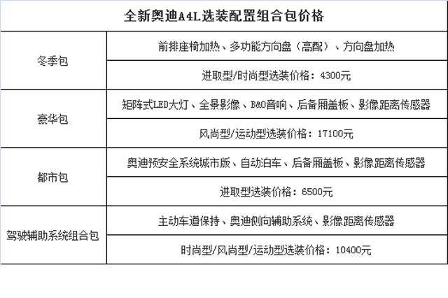 豪华包:矩阵式LED大灯提升外观视觉效果,让路人在车流中一眼认出奥迪的轮廓。全景影像为你提供全方位的车辆周边环境投影,再辅以影像距离传感器,能有效避免蹭刮。更有来自丹麦的世界顶级B&O音响,精良的喇叭单元为你提供极致的听觉盛宴。对音响要求较高的朋友,选它准没错。