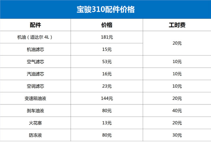 而更贴心的是,宝骏310的免费首保服务(3个月或5000公里)包含了机油更换、机油滤芯更换以及工时费在内的全部保养费用。首保,没有任何一分的费用。