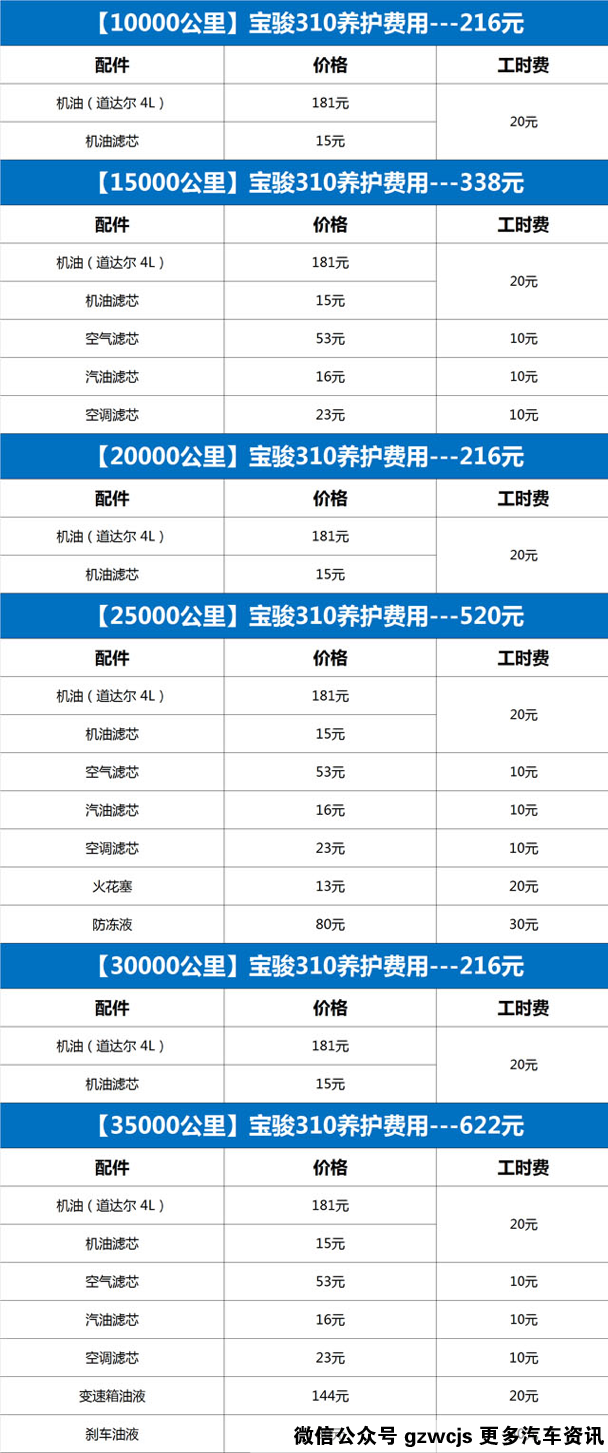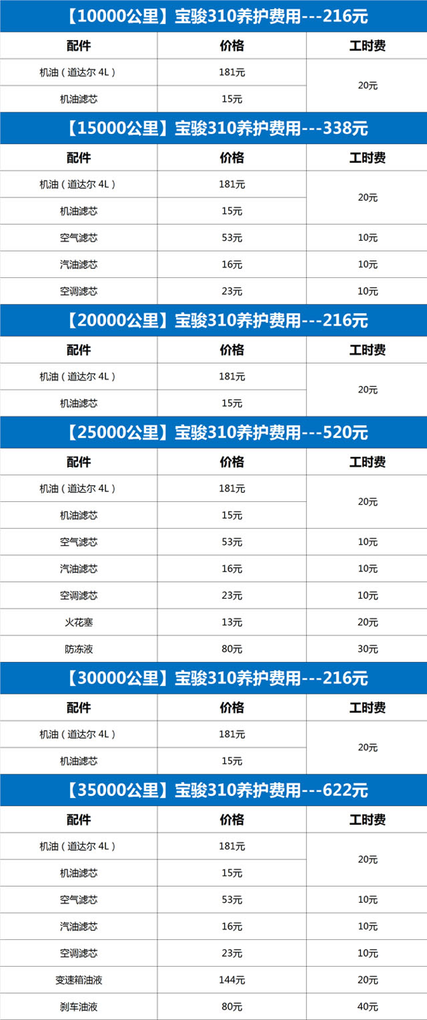 按照宝骏310维修保养手册的标准,宝骏310三年下来的正常养护费用只需要2128元(按每年行驶15000公里为标准)。倘若把笔养护费用按天来计算,呵呵,那真是吓坏宝宝---1.9元。相信我,这不是电视购物的忽悠。