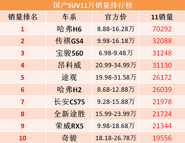 哈弗H6不愧为国民神车啊,11月销量达到历史最高纪录70292辆,这还能玩吗,不过最重要的原因是人家车型多,选择性强,针对的人群更广,红标运动版、蓝标运动版、升级版,改款运动版、coupe版总共加起来将近70款车型,问你怕了没。