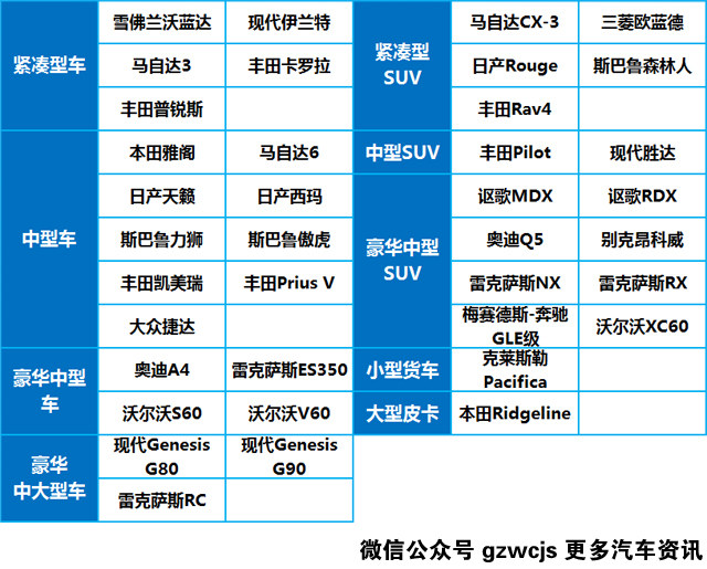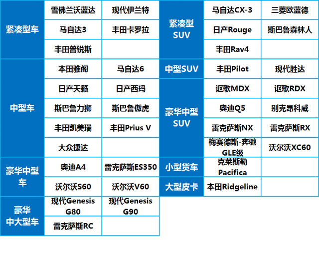 最后,教授整理了所有获得了TSP+评价的车辆,车辆的分级是参照IIHS官网的,因为IIHS把大众捷达放在了中型车的级别,原因未明,还有,老美说的小型货车其实就是我们平时说的MPV。