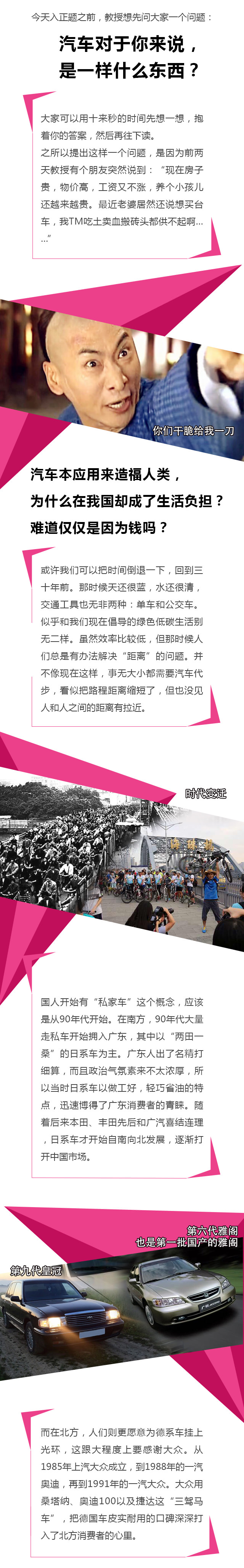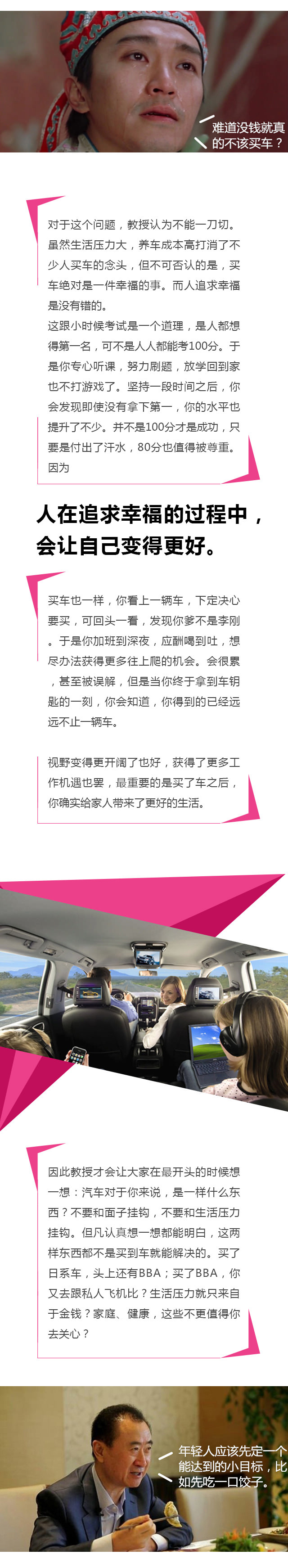 教授总结:汽车,归根到底只是汽车。如果你是爱车之人,车子于你来说可以有情怀,有回忆,但终究改变不了它是交通工具的本质。心境才是最重要的。希望大家在下次开车的时候,能少一点留意发动机是不是够力,内饰是不是真皮,而多点去想一想,你真正从这辆车得到了什么。