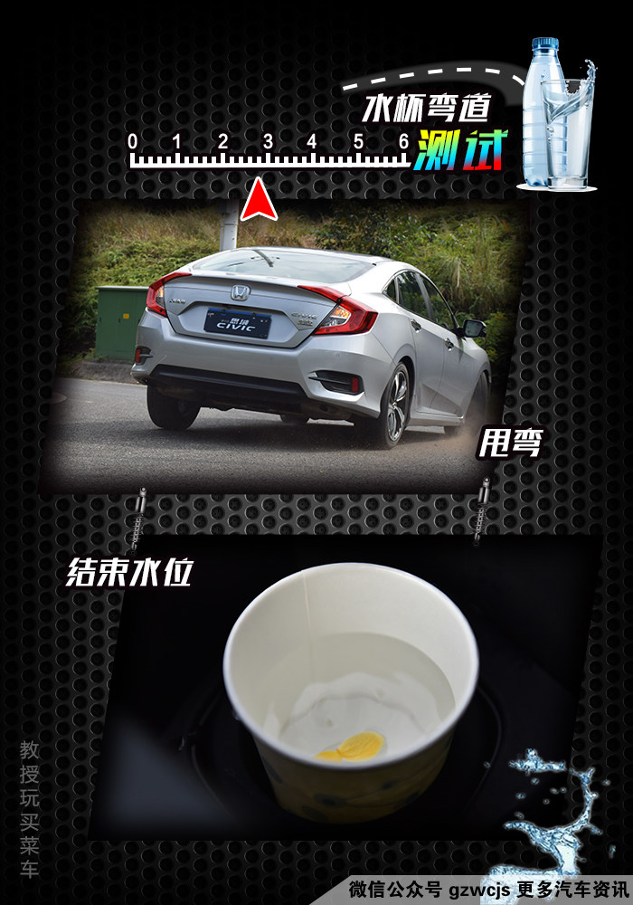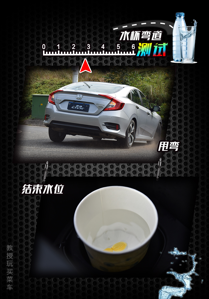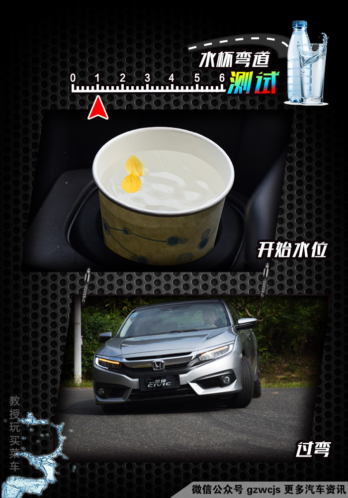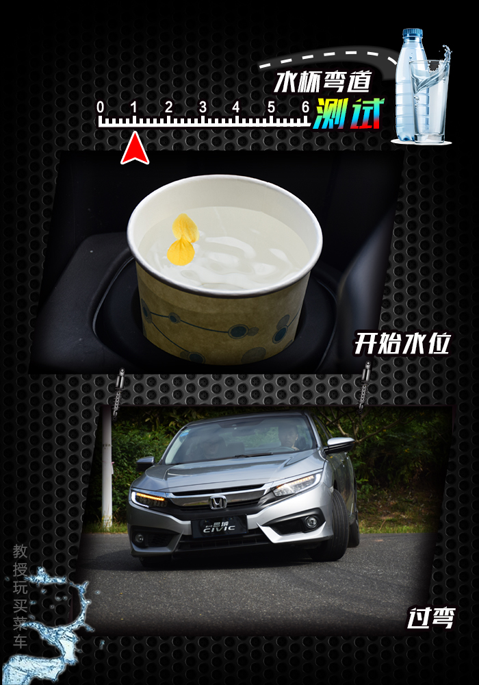 测完百公里加速和刹车距离之后,我们来看看过弯时的侧倾,这次测速的参照物为一个水杯中的水(之前有朋友建议放一筐水豆腐上去的,但由于教授没有藤原拓海的车技,所以还是放一杯水算了),一开始满水的时候,水位为距离杯口1公分处。