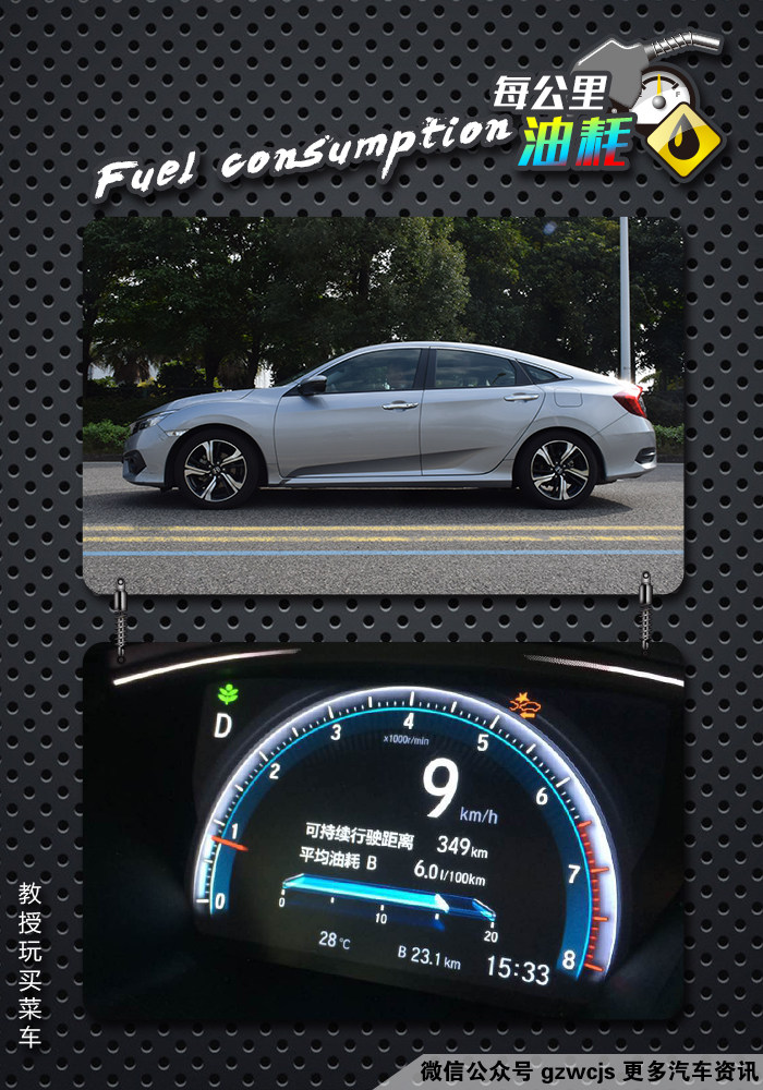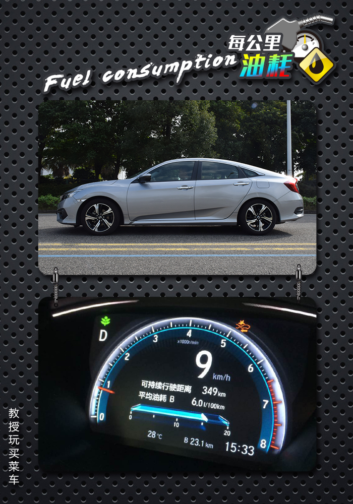 整体来说思域给人的动态表现算是意料之中,但并没有太大的惊喜之处,虽然在生活中我们未必会“全地板油”地去测试某辆车的动力,也未必会一脚刹车踩到底地去测速它的刹车距离,但这些参数能够多多少少帮助我们去判断一辆车的性能动态表现,如果你和教授说:“教授,其实我买个车回来就是平时用来开而已,你直接告诉我这个车实用性如何吧。”那么接下来我们来看看油耗。