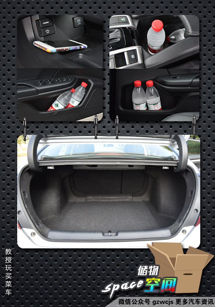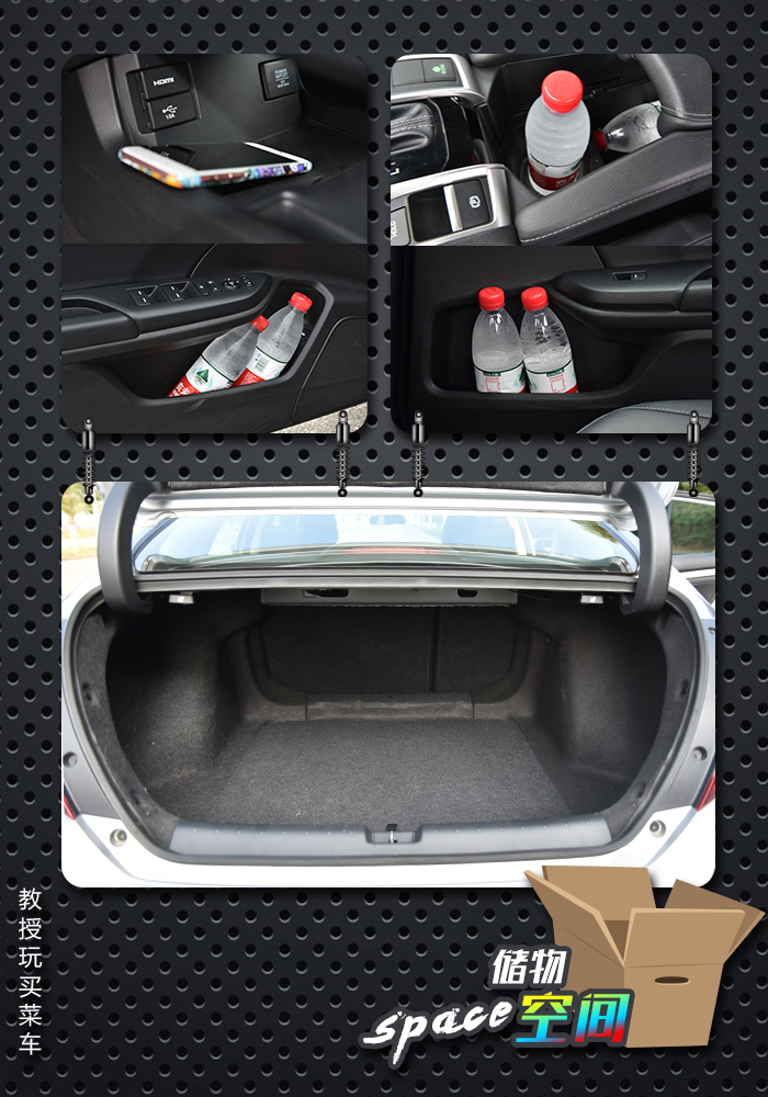 紧接着来看看储物空间,基本在门板的位置,我们能够刚好放入1瓶标准的矿泉水,如果硬塞2瓶进去的话,则有点勉强,中控位置的话,在显示屏下方还有一块镂空的地方,有着一个点烟器插孔,USB插孔和连接显示屏的HDMI孔,扶手箱空间也蛮大,支持放置各种杂物。后排空间支持放倒,但由于后悬挂采用多连杆独立悬挂,所以在尾箱的地方会有两个凸起,储物空间还是足够,由于车尾采用溜背设计,所以后尾箱开口的面积比较小。