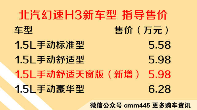 近日,北汽幻速官方宣布,北汽幻速H3手动舒适天窗版车型已经正式上市!它的售价仅为5.98万元,这款车型是在H3舒适型的基础上加入了许多配置,但是售价没有增加!