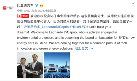 教授再深八一下,发现小李子代言比亚迪,可以用四个理由来总结——