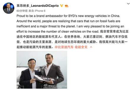 很多人以为小李子开了微博之后天天发关于环保的内容,是为代言比亚迪做伏笔,可教授翻墙帮你证实:小李子在推特和ins上面发的内容,没有风花雪月,没有八卦绯闻,尽是对气候变化的关注和对环保理念的呼吁,和在中国的微博上画风一致。