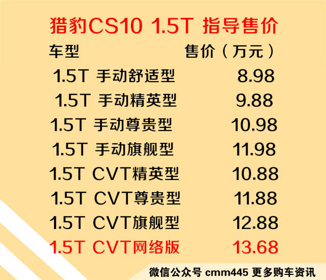 猎豹CS10推出了搭载1.5T发动机的车型,该发动机最大功率150马力,峰值扭矩为210牛米。而它搭配的将是5挡手动或CVT变速箱!
