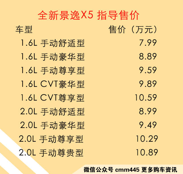 全新景逸X5搭载1.6L和2.0L两款自然吸气发动机,搭配5挡手动、CVT变速箱!另外它采用了LQ-CMF平台技术。