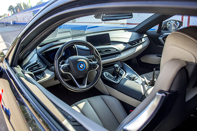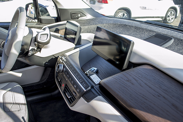 接下来从BMW X1插电式混动转移到了BMW i3,教授的第一反应是:科技与环保。一打开那对开式的车门,就能够看到一部分裸露在外的碳纤维车架,接着映入眼帘的就是科幻的内饰设计与环保的内饰用料。