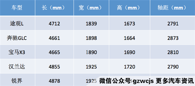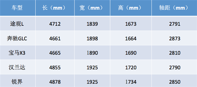 既然途观L剑指中级SUV车市,那自然要符合中级SUV的定义。目前中型SUV市场上的主流车型,例如:汉兰达、锐界、奔驰GLC和宝马X3等等,它们的车身长度都在4600-4800mm之间,轴距则在2700-3000mm。