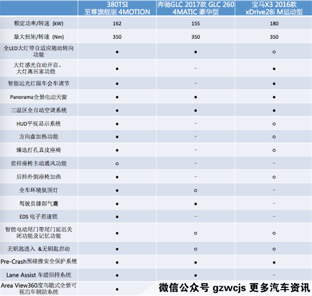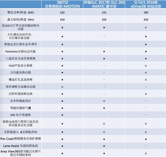 以三个款车型的顶配车型为例,通过对比,我们发现途观L在配置上还是有着不小的优势。例如:途观L像豪华品牌奔驰GLC和宝马X3一样,都配置了全景电动天窗以及三温区全自动空调系统。再就是途观L安装了先进的HUD平视显示系统,但是奔驰GLC则没有配备,而宝马X3也只是选装。同时,我们还会发现,途观L的动力性能同样很不错,足以和奔驰GLC和宝马X3相媲美。所以这样比较下来,途观L的配置优势,为其在中级SUV市场的激烈中占据不小的优势。