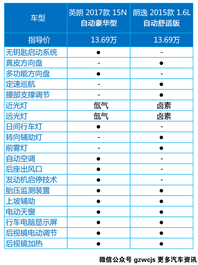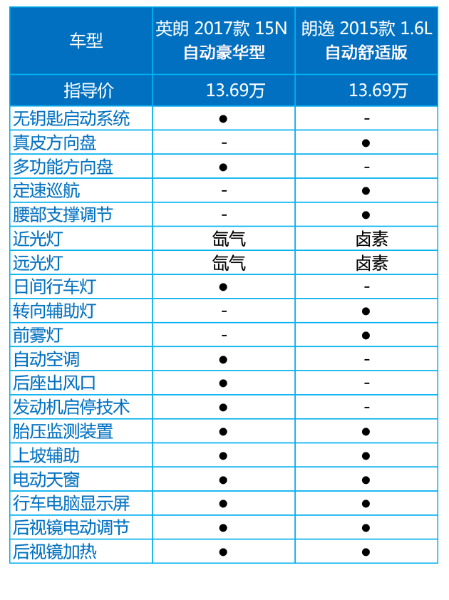 配置方面,对比的是指导价同为13.69万元的两款车型,两车的配置侧重点不太一样,朗逸更加注重于与驾驶安全相关方面,例如定速巡航,带有转向辅助功能的前雾灯,英朗则是注重舒适性与便利性,就好比无钥匙启动、多功能方向盘、自动空调、后排出风口,值得注意的是,两车都拥有胎压监测和后视镜加热这些非常实用的配置,还是挺厚道的。