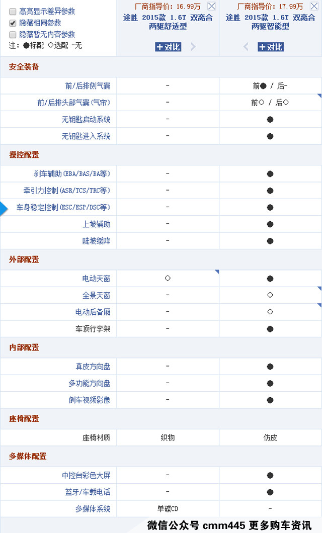 1.6T车型,我会推荐买指导价为17.99万的两驱智能型,其比最低配贵了1万元,但是多出了许多实用性配置,包括日间行车灯、自动头灯、自动空调、后座出风口和温度分区控制等等,其余一些配置差异可看下表。