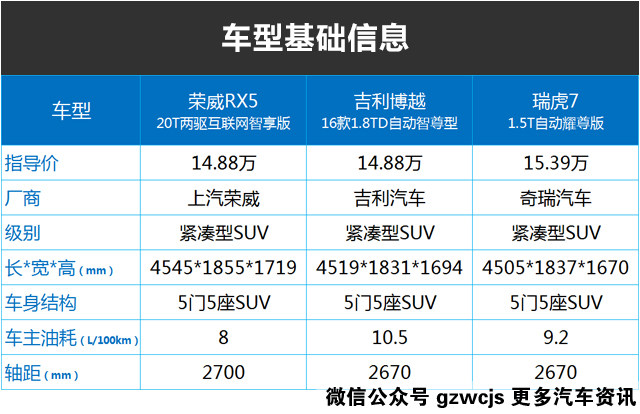 在售价方面,三者者都相差不大,所以这一次均推荐15万左右的版本,虽然三方都定位在紧凑型SUV上,但是在车身尺寸上,瑞虎7就稍显劣势。而今天所说的,荣威RX5两驱互联网智享版和博越1.8T自动智尊型是最多消费者选则的车型配置,而瑞虎7卖得最好的版本应该为2016款 1.5T 手动耀臻版,但为了在价格方面做到平衡,所以改为了耀尊版车型。