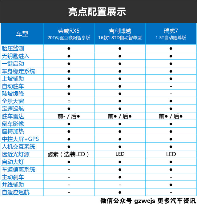 目前在中国汽车市场上最受关注度最高的三款国产SUV是什么?荣威RX5、吉利博越、奇瑞瑞虎7,这三台车都有一个什么样的优势?比同价格的合资车型配置更高、比同级别的合资车紧凑型SUV价格更低!在外观设计上面,它们都有各自的亮点,荣威RX5的设计可以说是跑在了众多自主品牌前列,原创度极高的它一度成为了市场上的爆款。吉利博越在上市之初就被评委最美的国产SUV,就是这么漂亮;而奇瑞瑞虎,虽然在设计上并没有太多惊艳的感觉,但胜在原创度都非常高。