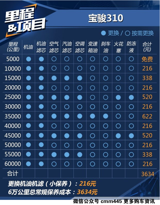 六万公里保养费用:3210元(MT)/3518元(AT)