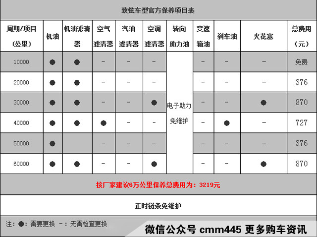 致炫是这几款车中最晚开始首保的,要到1万公里才开始,之后每隔1万公里进行一次保养。另外还有一点,致炫在六万公里内并不需要更换变速箱油,这也是其保养费用较低的重要原因。