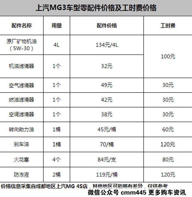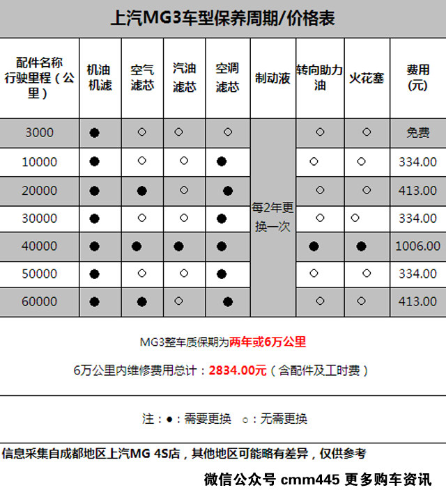 这个保养费用恐怕是各位车主都想不到。究其原因,MG3从二保开始便是一万公里一保养,不仅节省了车主的时间,还免去了一些费用。另外,宝骏310的汽油滤芯是一万公里换一次,而MG3的是四万公里换一次;还有火花塞方面,宝骏310是两万公里换一次,而MG3四万公里换一次。以上,都是MG3的保养费用如此低的原因。