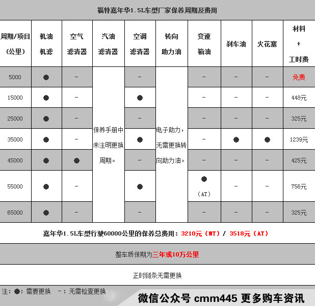 嘉年华只要三千多的保养费用,确实有点让人意外,但是这仅针对1.5L车型。从表中可以看出,如此低的保养费用也是因为从首保以后,嘉年华便是一万公里一保养,同时空气滤清器要去到45000公里才更换。