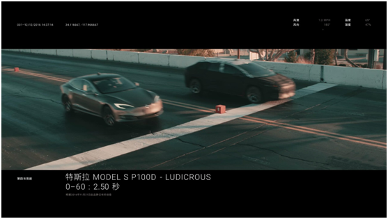 众所周知,现如今0-100公里加速最快的车型是Tesla Model S P100D。该车为双电机四驱系统,Sport(运动模式)下从静止加速到一百公里时速用时2.7秒,在开启Ludicrous (狂暴模式)时,这个时间缩短了0.2秒,以2.5秒并列成为目前全球最快的量产车。
