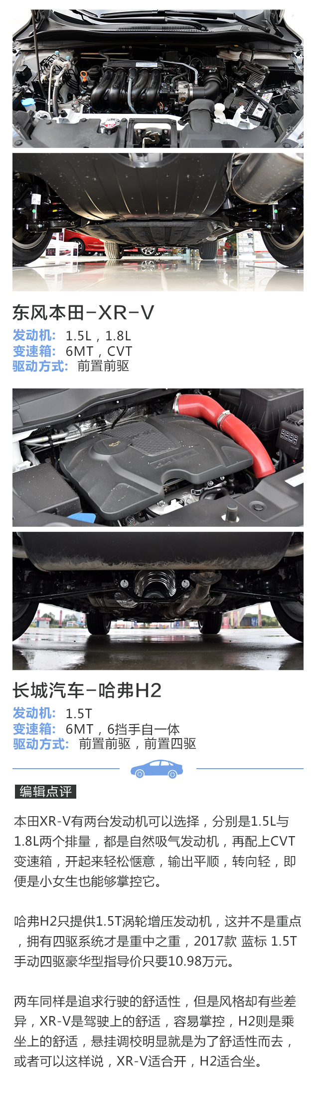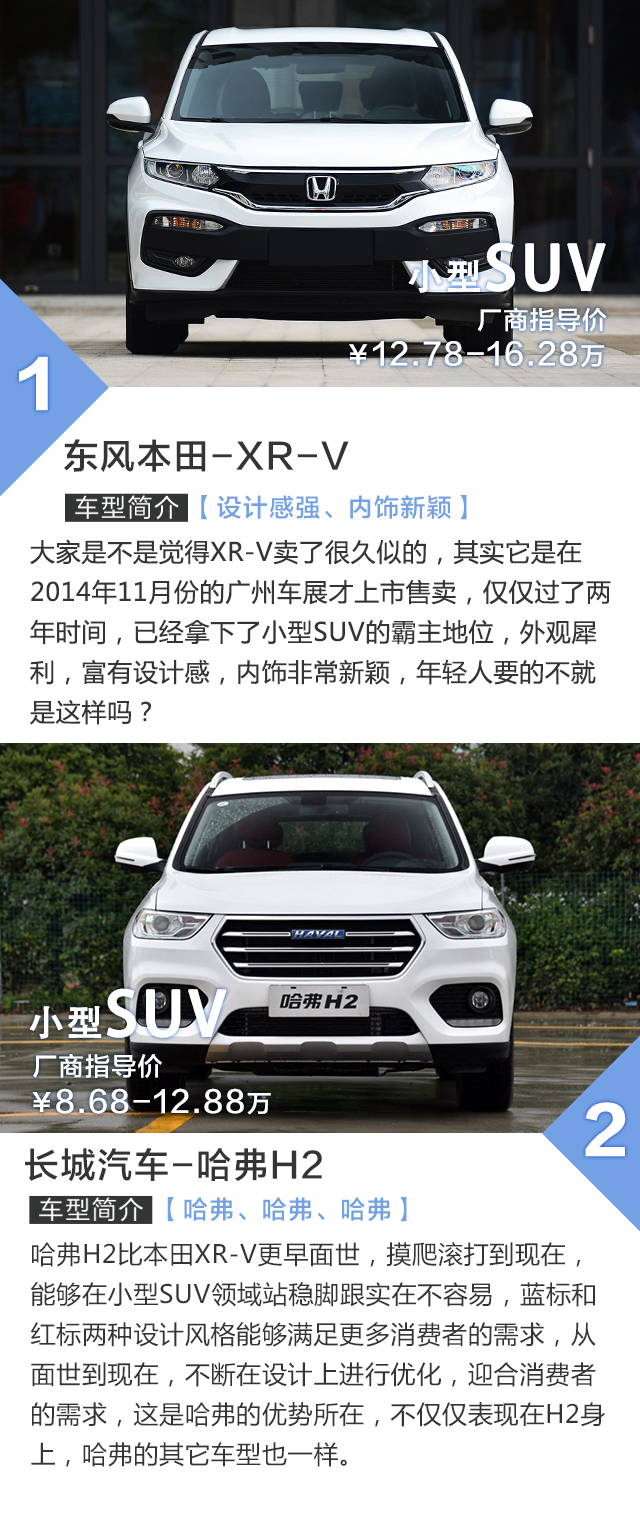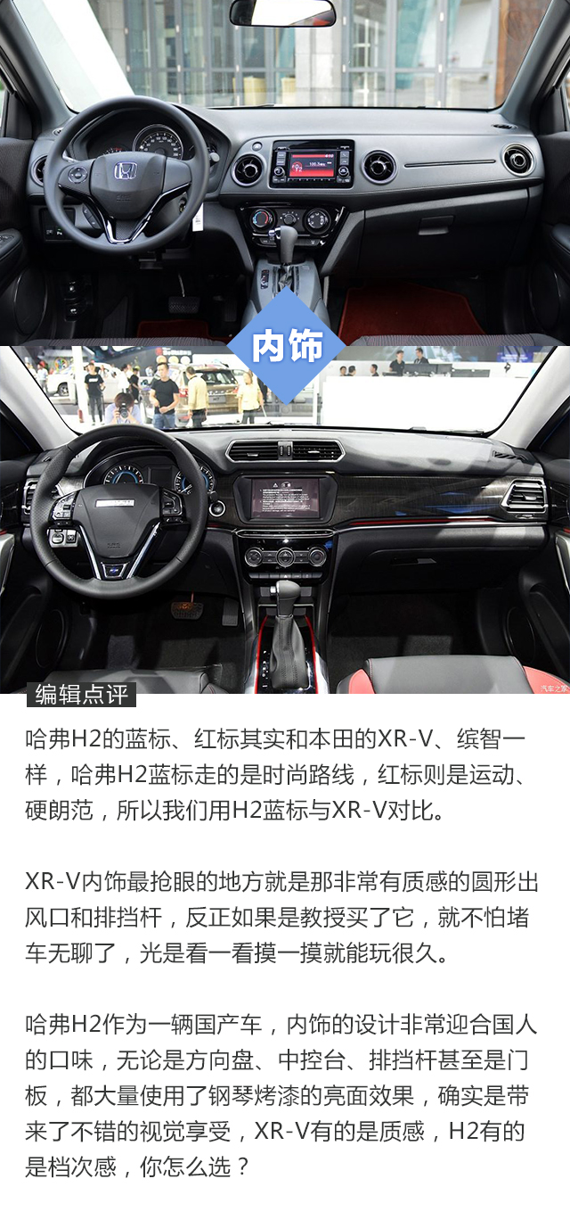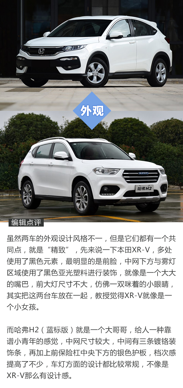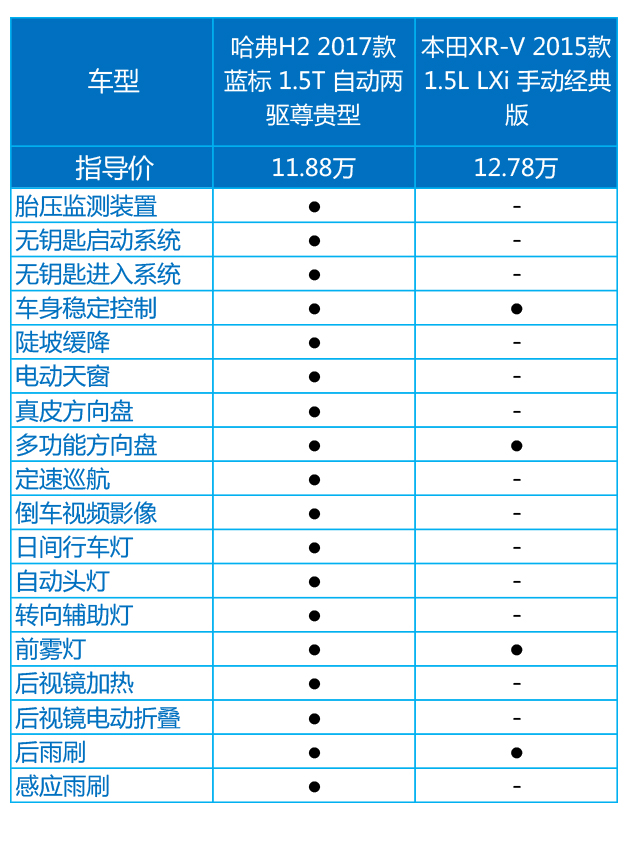 我们拿价格最相近的两个车型进行对比,其实就是H2的顶配与XR-V的最低配,即使是不看配置对比表格,大家都猜得出结果,不光是哈弗H2,整个哈弗品牌都是走高配置路线,H2很明显更加适合追求用车便利性的消费者,XR-V则是适合务实型的消费者。