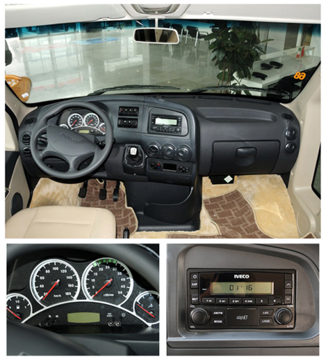 而依维柯的中控 则采用了深灰色的内饰配色,整体看起来略微有些沉闷。并且空调的出风口以及手套箱的设计相对过于紧凑,让人感觉整个中控台略微有些凌乱。四辐式的方向盘造型也难以提升驾驶员的驾驶兴趣。