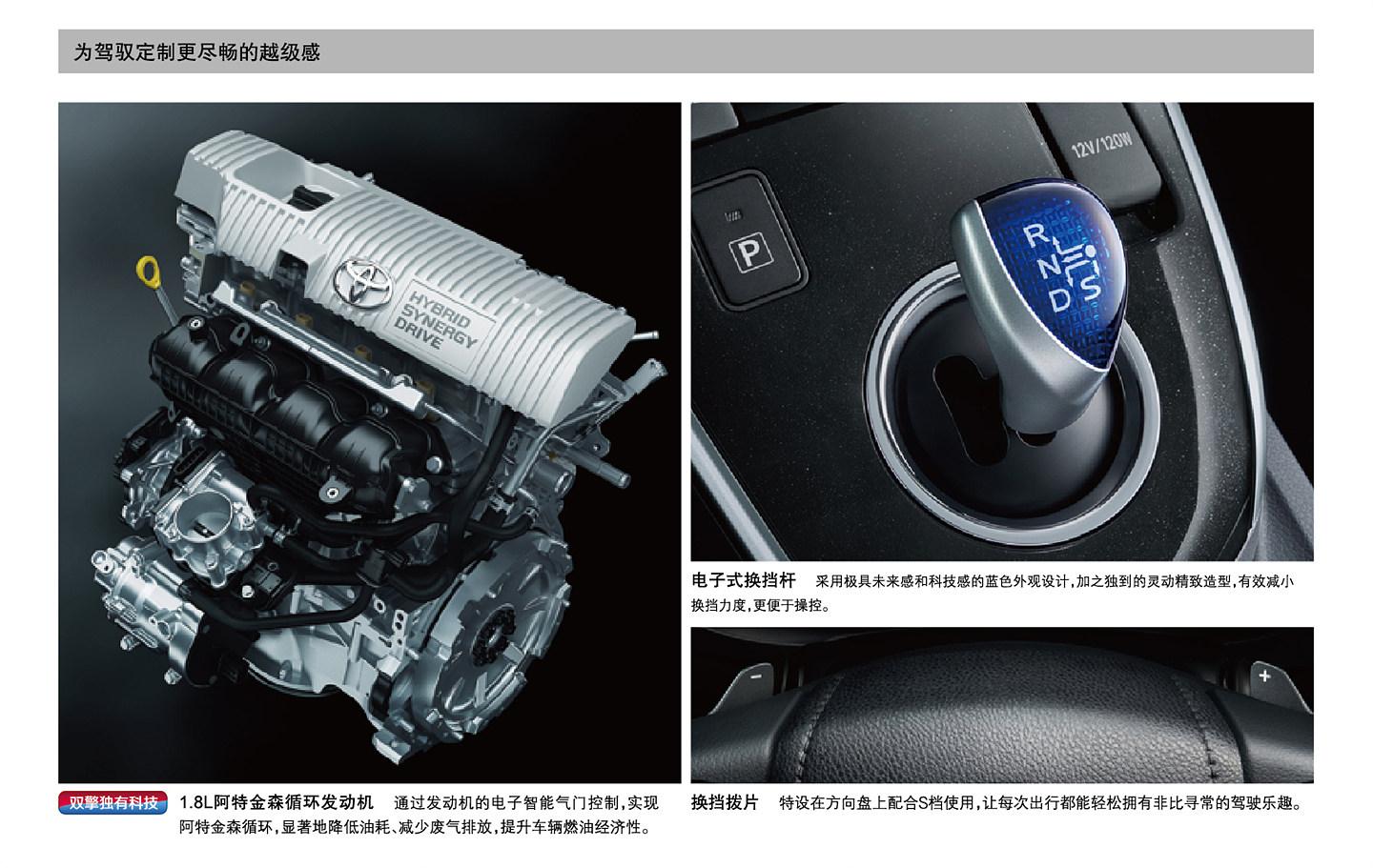 发动机采用的是1.8L阿特金森循环发动机,最大99匹马力,最大扭矩142Nm;电动机是永磁同步机,最大功率53Kw,最大扭矩207Nm;同时搭载ECVT电子无极变速箱和高功率混合动力蓄电池,电机输出功率占整个动力系统输出功率的53%,属于成熟的强混车型。