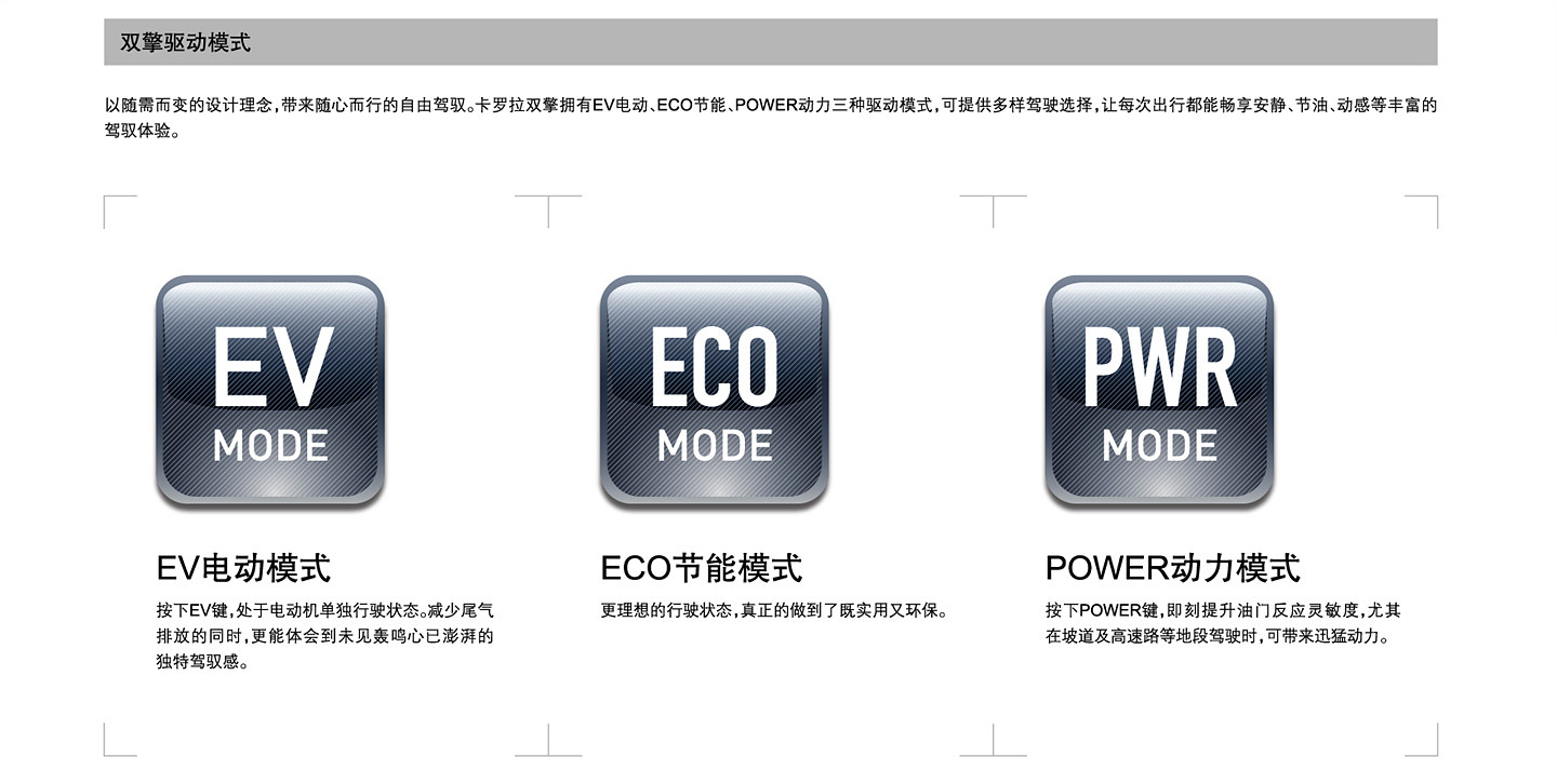 在前中段加速中,卡罗拉双擎就展现了很不错的调校功力,20-50公里中段加速官方标注的是3.1秒,在实际驾驶中,能感受到油门响应是非常灵敏的,点一下就走,深踩提速有很强的推背感。根据各种路况,卡罗拉双擎会有不同的驱动方式,如果你踩下地板油,它当然会很聪明地给足所有马力。