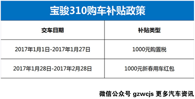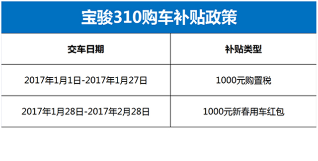 消费者因为买不到车着急得很,对于上汽通用五菱来讲,满足客户的需求自然是首要的任务。针对消费者的担忧,宝骏310推出了高达一千元的购车补贴。其中,在1月1日-1月27日提车的消费者,上汽通用五菱将统一给予1000元购置税补贴;在1月28日-2月28日提车的客户,将不再享受1000元的购置税补贴,但交车时将统一收到上汽通用五菱提供的1000元新春用车现金红包用以弥补消费者在春节期间不能及时开上新车的遗憾。简单来说,就是在2017年2月28日之前购买宝骏310的消费者,都能够享受到1000元的购车补贴。而这一笔购车补贴的效果,实际上也等同于现行的购置税补贴政策。