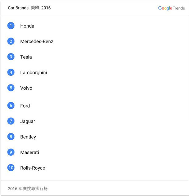 据Google Trends近日公布的2016年度搜寻清单来看,在汽车品牌这一类别中,位列榜首的并非德系三强,而是一向以技术著称的日系本田。更值得一提的是,Google今年采用了与去年不同的计算方式,既结合了去年的搜寻次数,亦结合了“最高搜索流量和最持久峰值搜索流量”的数据,由此产生的榜单含金量相比往年来得更高。如此看来,在高含金量的2016榜单之中,日系本田力压奔驰、特斯拉等一众豪华德系美系品牌获此殊荣,更具说服力。