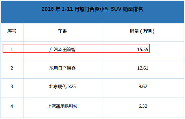 作为广汽本田首款SUV车型,缤智自上市起便肩负广汽本田打入国内SUV市场的重任。在上市短短2年时间里,缤智就以累计快高达30万用户,一举成为广汽本田旗下主打车型,同时更夺得前十一个月合资品牌小型SUV销量冠军。在帮助本田力压其他日系对手成就日系在华销量第一的同时,缤智早已不负众望地扛起了广汽本田SUV市场的大梁。