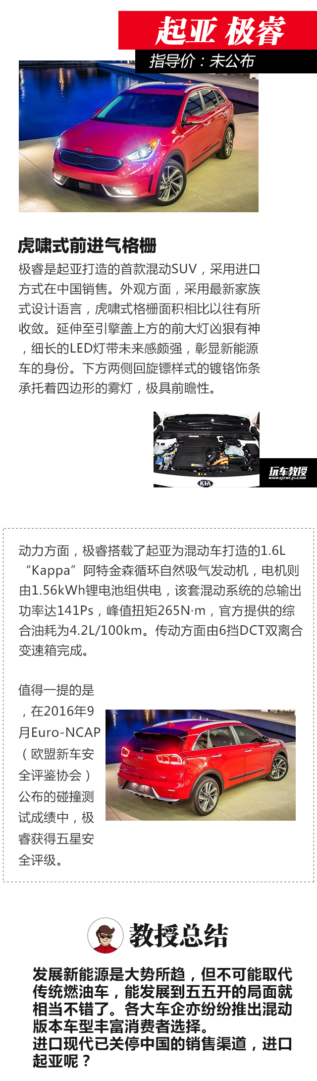 途观L出众的产品力自然配得起不低的售价,还没量产的1.4TSI版本相信会是途观L销量的主力军;1.5T的杰德能否不负众望,兼顾运动与使用呢?教授甚是期待;思铂睿混动则在能耗和性能之间找到一个均衡点,售价才是关键;而进口起亚极睿则是起亚旗下的第一款混动紧凑型SUV,对于企业来讲有着里程碑式的意义,各大车企纷纷开始把鸡蛋放到新能源的竹篮里。