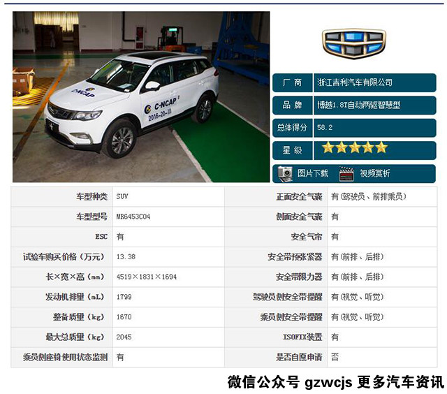 C-NCAP自个去4S店买了一辆博越(博越1.8T自动两驱智慧型),做了一场安全碰撞测试。呵呵,58.2分的成绩,5星评价。什么概念?神车途观(上代)的成绩是48.2分,主打安全的福特翼虎是55.9分。当然,不是说途观跟翼虎的表现不好,只是因为博越牛逼得有点过分。在完全正面碰撞试验里,博越的得分成绩比例为95.17%,接近满分。而侧面碰撞试验里,则完全满分。就一个字:太特么强悍。