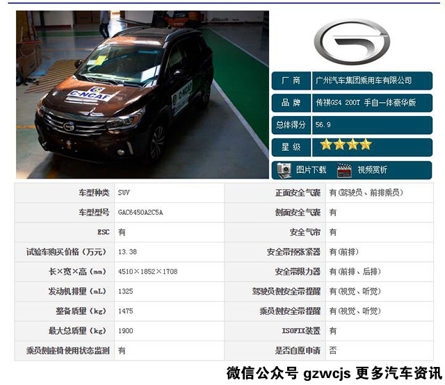 所以,C-NCAP也心狠手辣地到市场上买了一辆传祺GS4(传祺GS4 200T 手自一体豪华版),并且做了安全碰撞测试。结果,噔噔噔噔~总体得分56.9分,4星评价。同样也是秒天秒地,秒大众的节奏。总得分,甚至还比豪华品牌X1还要高山0.3分。要是你特别在意安全,不用买宝马,买传祺就好了。