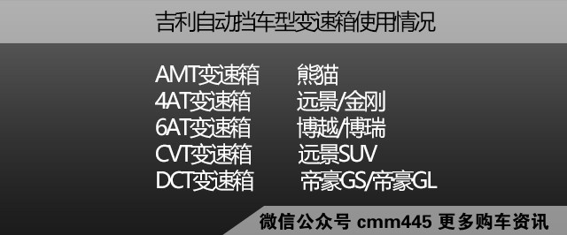 而在小编看来是为了统一产品线,目前在吉利的自动挡产品序列中主要有使用4AT变速箱的金刚以及远景轿车,使用6AT的博瑞/博越。使用双离合的帝豪GS/帝豪GL,和使用CVT变速箱的远景SUV,以及使用AMT变速箱的熊猫自动挡。