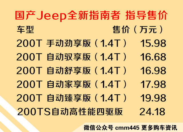 广汽菲克Jeep全新指南者在12月28日正式上市了,这次共推出了6款车型,除了顶配的200TS 自动高性能四驱版车型采用2.4L发动机以外,其余车型均采用了1.4T发动机。