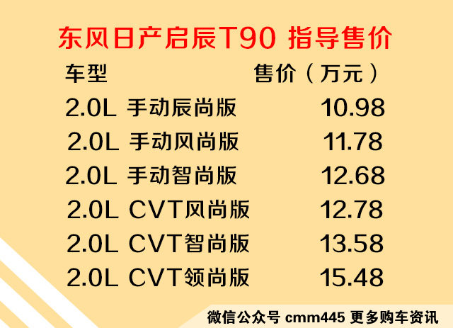 启辰T90的售价颇具竞争力,它空间不错、做工和品质也比较良好。并且我静态体验过这款车,感觉它内饰用料很厚道。自动挡的中配以上车型配置丰富,值得推荐!