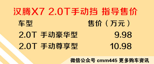 汉腾X7此次推出了两款搭载2.0T发动机的手动挡车型,该发动机为三菱的4G63S4T型2.0T涡轮增压发动机,最大功率190马力、峰值扭矩为250牛米,配合5速手动变速箱。