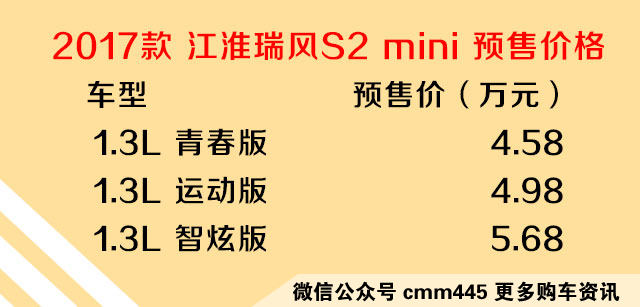 日前,江淮旗下全新的小型SUV--瑞风S2mini预售价正式发布。它的售价较低,而且新车3大核心部件可享受5年/20万公里的质保。另外这款新车将在2017年1月18日正式上市!