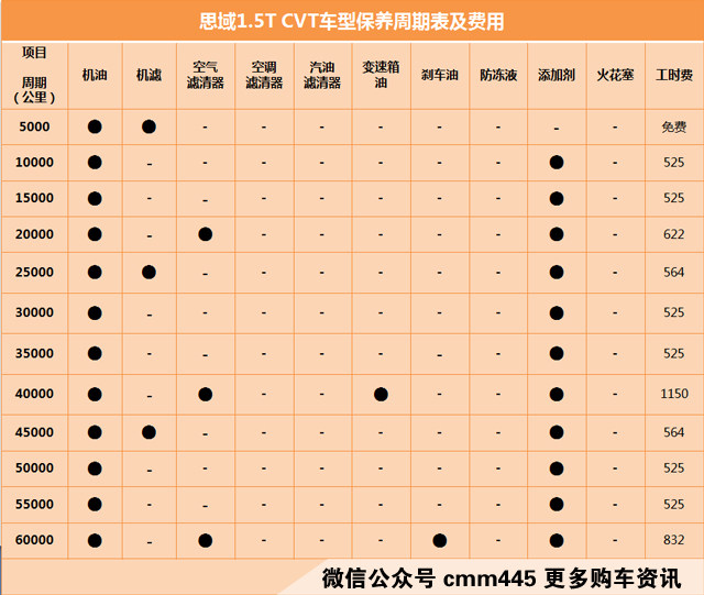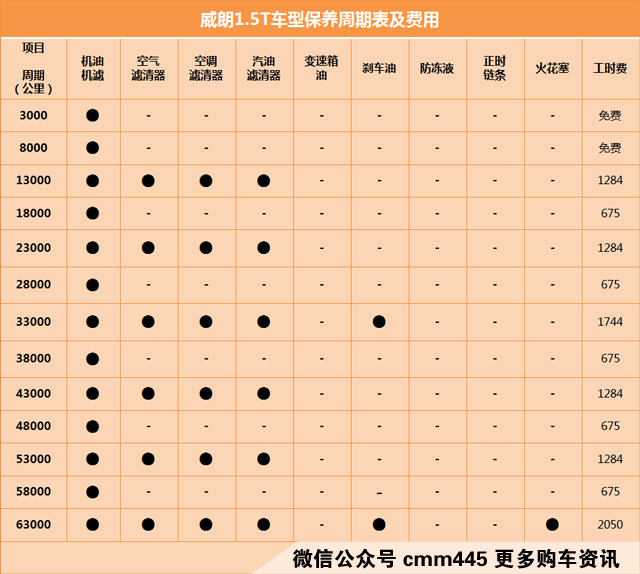 六万三千公里总保养费用:12305元(1.5T车型)/8356元(1.5L MT车型)/9270元(1.5L AT车型)
