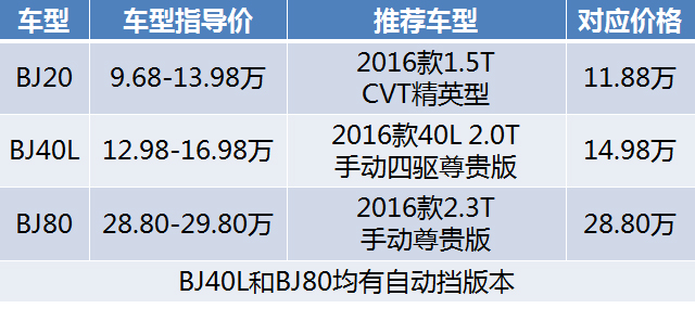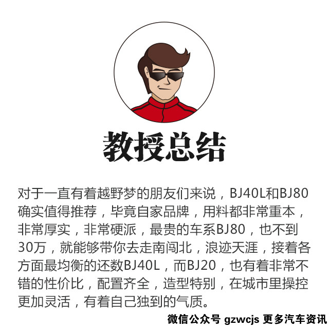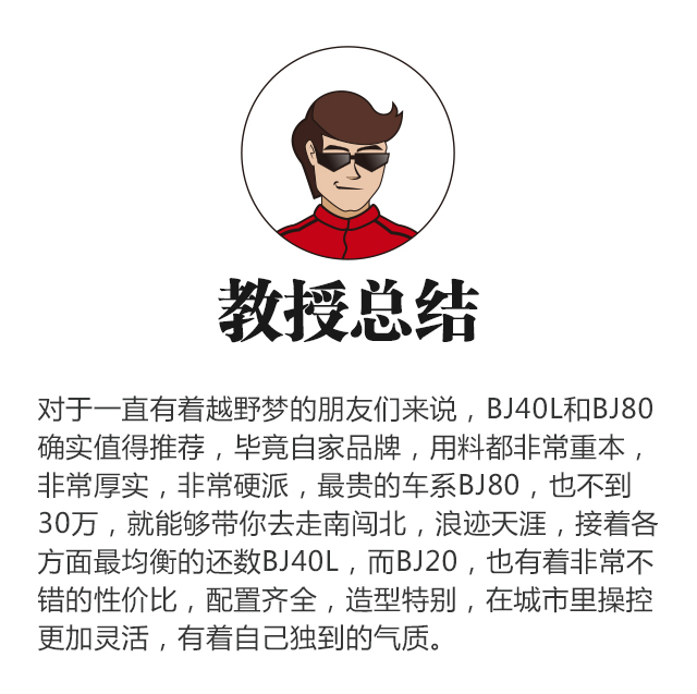 基于萨博技术为载体,重点生产硬派越野车和轿车的品牌,其中越野车系列有BJ40和BJ80,都采用非承载式车身,分时四驱技术,2.3T涡轮增压发动机,这可都是城市SUV所罕见的硬派元素,却也是喜欢越野的人群所仰慕的设计。